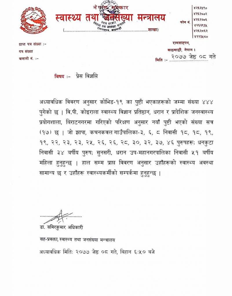 काठमाडौं : नेपालमा थप १७ जना कोरोना संक्रमित थपिएका छन्। बिहीबार बिहान नयाँ संक्रमित थपिएसँगै कोभिड-१९ का पुष्टी भएकाहरूको जम्मा संख्या ४४४ पुगेको छ। स्वास्थ्य मन्त्रालयका सहप्रवक्ता समिर कुमार अधिकारीले वि.पी. कोइराला स्वास्थ्य विज्ञान प्रतिष्ठान, धरान र प्रादेशिक जनस्वास्थ्य प्रयोगशाला, विराटनगरमा गरिएको परीक्षणमा १७ जना नयाँ संक्रमित थपिएको जानकारी दिए ।