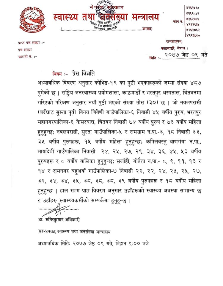 स्वास्थ्य मन्त्रालयका सहप्रवक्ता समिरकुमार अधिकारीले राष्ट्रिय जनस्वास्थ्य प्रयोगशाला, काठमाडौं र भरतपुर अस्पताल, चितवनमा गरिएको परीक्षणमा ३० जना नयाँ संक्रमित थपिएको जानकारी दिए।