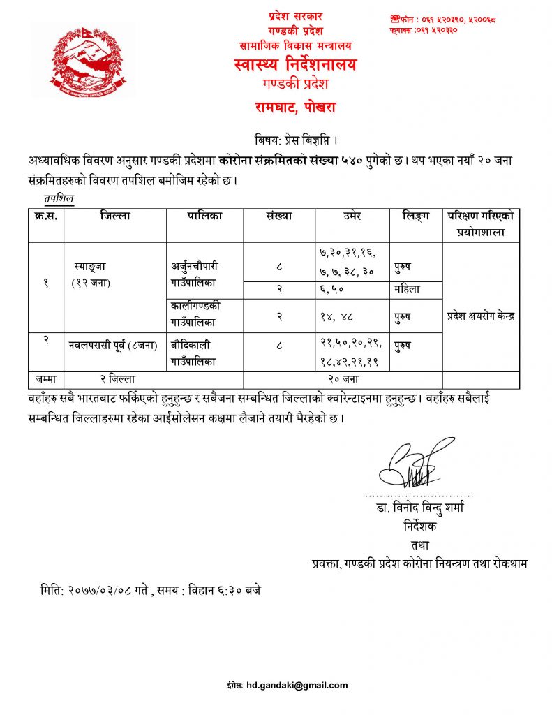 काठमाडौं : गण्डकी प्रदेशका दुई जिल्लामा थप २० जना कोरोना भाइरस संक्रमित फेला परेका छन् । स्याङ्जामा १२ र नवलपुरमा ८ जना संक्रमित फेला परेका हुन् । यससँगै गण्डकी प्रदेशमा कोरोना संक्रमण पुष्टि भएकाहरुको संख्या ५ सय ४० पुगेको छ ।