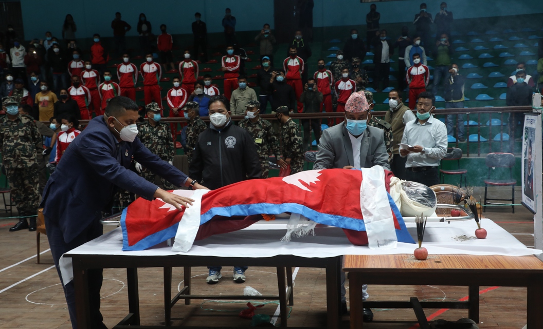 काठमाडौं : उसु खेलाडी वीरमान वाइबालाई सोमबार अन्तिम श्रद्धाञ्जलि दिइएको छ । आइतबार निधन भएको वीरमानको पार्थिव शरीर सोमबार त्रिपुरेश्वरस्थित राष्ट्रिय खेलकुद परिषद् (राखेप) मा राखिएको थियो ।