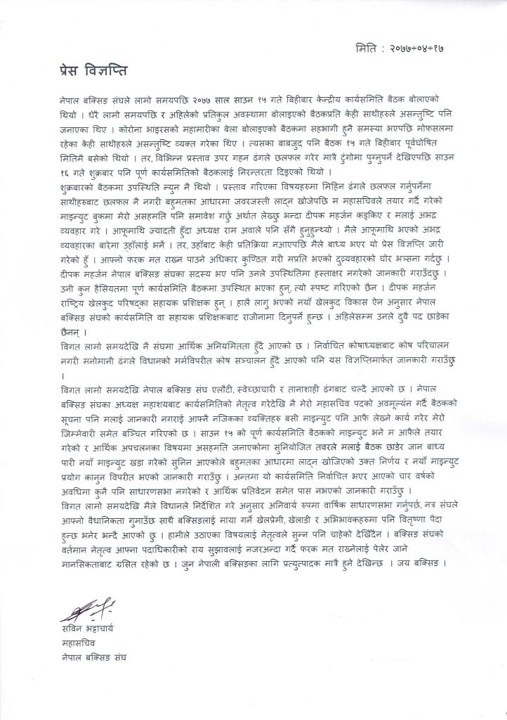 महासचिव भट्टाचार्यले विगत लामो समयदेखि नै संघमा आर्थिक अनियमितता हुँदै आएको र निर्वाचित कोषाध्यक्षबाट कोष परिचालन नगरी मनोमानी ढंगले विधानको मर्मविपरीत कोष सञ्चालन हुँदै आएको पनि उल्लेख गरेका छन् । ‘विगत लामो समयदेखि नेपाल बक्सिङ संघ एलौटी, स्वेच्छाचारी र तानाशाही ढंगबाट चल्दै आएको छ । नेपाल बक्सिङ संघका अध्यक्ष महाशयबाट कार्यसमितिको नेतृत्व गरेदेखि नै मेरो महासचिव पदको अवमूल्यंन गर्दै बैठकको सूचना पनि मलाई जानकारी नगराई आफ्नै नजिकका व्यक्तिहरु बसी माइन्युट पनि आफै लेख्ने कार्य गरेर मेरो जिम्मेवारी समेत बञ्चित गरिएको छ’, उनले भनेका छन् ।