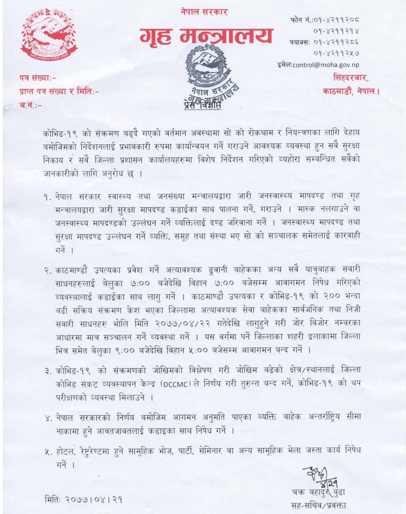 ‘काठमाडौं उपत्यका र कोभिड–१९ को २०० भन्दा बढी सक्रिय संक्रमण केश भएका जिल्लामा अत्यावश्यक सेवाबाहेकका सार्वजनिक तथा निजी सवारी साधन भोलि मिति २०७७ ४ २२ गतेदेखि लागुहुने गरी जोर–बिजोर नम्बरका आधारमा मात्र सञ्चालन गर्ने व्यवस्था गर्ने’, प्रवक्ता बुढाले भने, ‘यस वर्गमा पर्ने जिल्लाका सहरी इलाकामा जिल्ला भित्रसमेत बेलुका ९ः०० बजेदेखि बिहान ५ः०० बजेसम्म आवागमन बन्द गर्ने ।’
