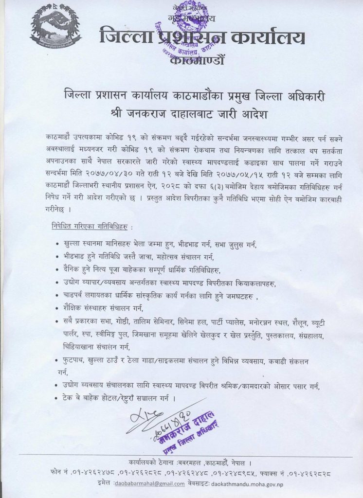 कोरोना संक्रमण बढ्दै जाँदा जनस्वास्थ्यमा गम्भीर असर पर्न सक्ने अवस्थालाई मध्यनजर गर्दै संक्रमण रोकथाम तथा नियन्त्रणका लागि तत्काल थप सतर्कता अपनाउन सरकारले जारी गरेको स्वास्थ्य मापदण्ड कडाइका साथ पालना गराउन भन्दै जिल्ला प्रशासनले यस्तो आदेश जारी गरेको हो। यो आदेश शुक्रबार राति १२ बजेदेखि भदौ १५ गते राति १२ बजेसम्मका लागि काठमाडौं जिल्लाभर लागू हुने आदेशमा उल्लेख छ।