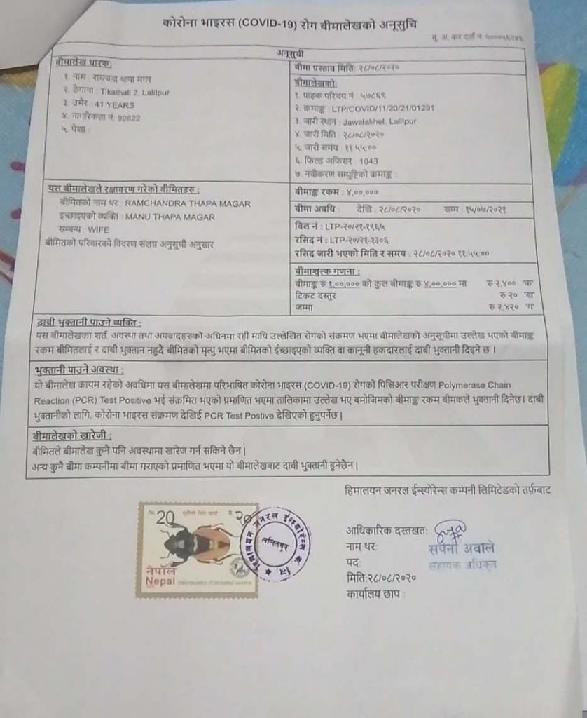 ओमनारायण श्रेष्ठले रेफ्री जर्जको बीमा गराउन लागेको सुइँको पाएपछि उनले पनि बिहीबार रेफ्री जर्जको कोरोना बीमा गरेको भन्दै पोलिसी हस्तान्तरण गरे । तर, उनले गरिदिएका अधिकांश रेफ्री जर्जको बीमा भने खेर जाने भएको छ । उनले गरेको बीमा पोलिसी अनुसार भदौ १५ गतेदेखि लागु हुने भनिएको छ । तर, ओमनारायणले गरिदिएको बीमा भने भदौ १२ गतेदेखि नै लागु भएको छ । कोरोना बीमाको नयाँ नीति अनुसार बीमा एक ठाउँमा मात्र गर्न पाइन्छ । एकभन्दा बढी कम्पनीबाट गरिएको बीमा स्वतः रद्द हुन्छ । त्यसैले राम अवालेले गरिदिएको २० रेफ्री जर्जको कोरोना बीमा रद्द मात्र भएको छैन, उनले फेसबुक म्यासेन्जरबाट हारगुहार गरेर मागेको पैसा पनि खेर गएको छ ।
