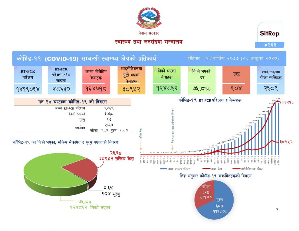 योसँगै नेपालमा कोरोना संक्रमितको कुल संख्या १ लाख ६४ हजार ७१८ पुगेको छ । तीमध्ये १ लाख २४ हजार ८३२ जना निको भएका छन् । पछिल्लो २४ घण्टामा ३०३८ जना निको भएका छन् ।