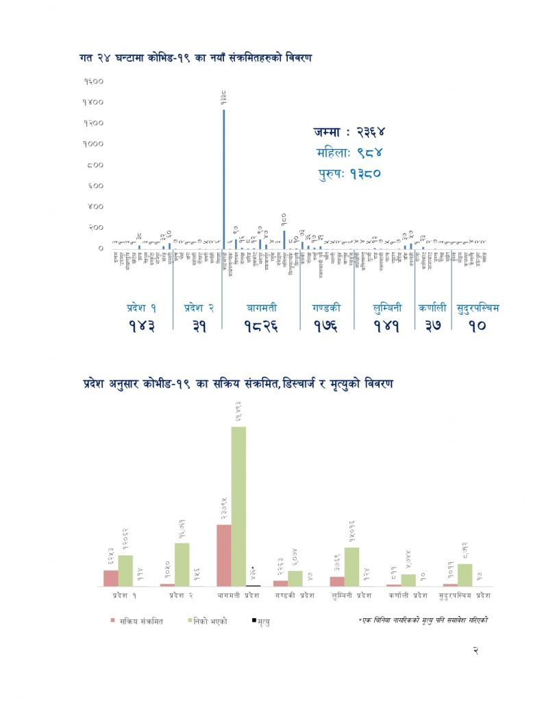 काठमाडौं : पछिल्लो २४ घण्टामा २३६४ जनामा कोरोना भाइरस संक्रमण भएको छ । स्वास्थ्य तथा जनसंख्या मन्त्रालयका अनुसार ९७६९ जनाको पीसीआर परीक्षण गर्दा १३८० पुरुष र ९८४ महिला गरी २३६४ जनामा संक्रमण पुष्टि भएको हो ।