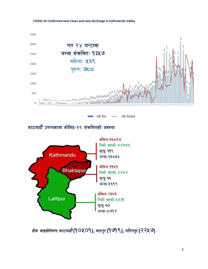 जसमध्ये ५ सय ६९ जना महिला छन् भने बाँकी ७८८ जना पुरूष हुन्। काठमाडौंमा ६१ हजार ८ सय ५५ जना कोरोना संक्रमित छन्। त्यसमध्ये ४४ हजार ७ सय ४६ जना निको भइसकेका छन् भने २१९ जनाको मृत्यु भएको छ। यस्तै, १६ हजार ८ सय ९० जना संक्रिय संक्रमित छन्।