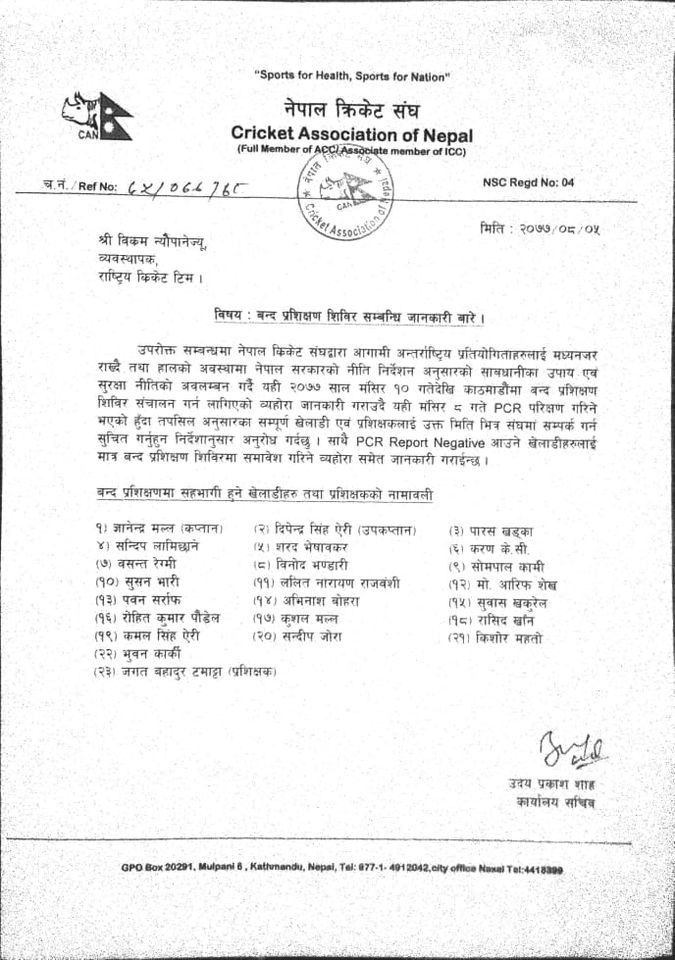 क्यानले बन्द प्रशिक्षणका लागि बोलाएका २२ खेलाडीमा कप्तान ज्ञानेन्द्र मल्ल, उपकप्तान दीपेन्द्रसिंह ऐरी, पारस खड्का, सन्दीप लामिछाने, शरद भेषवाकर, करण केसी, वसन्त रेग्मी, सोमपाल कामी, सुशन भारी, ललितनारायण राजवंशी, विनोद भण्डारी, आरिफ शेख, पवन सर्राफ, अभिनाश बोहरा, सुवास खकुरेल, रोहितकुमार पौडेल, कुशल मल्ल, रासिद खान, कमलसिंह ऐरी, सन्दीप जोरा, किशोर महतो र भुवन कार्की छन् ।