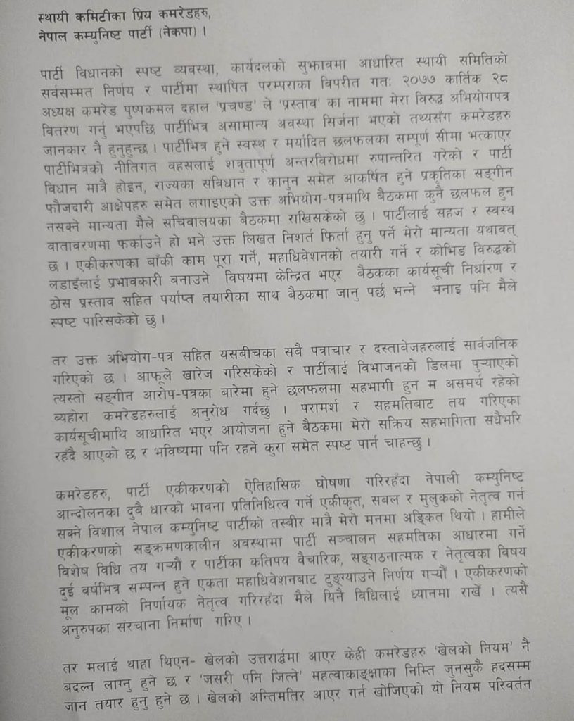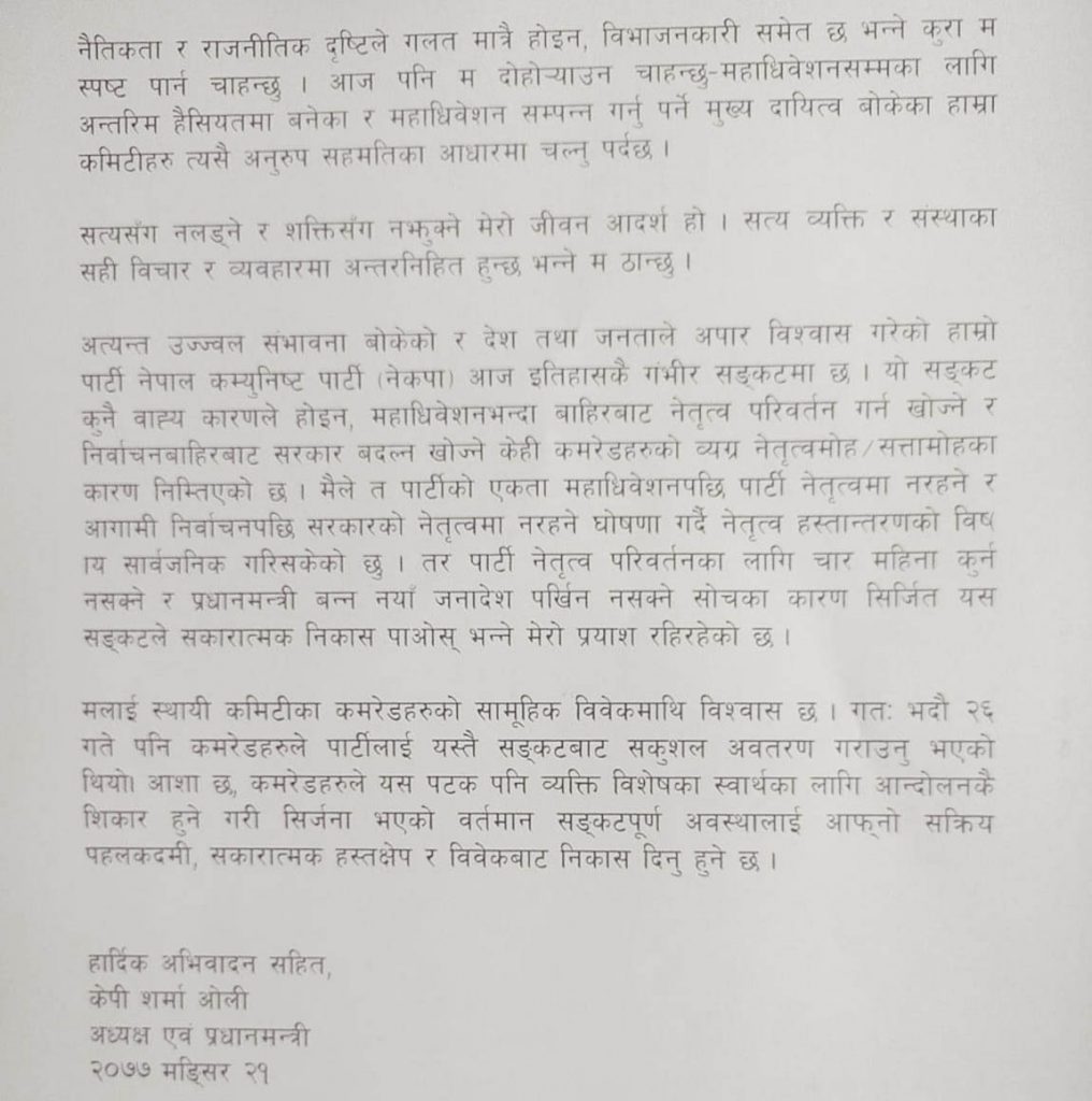 ओलीले स्थायी कमिटीमा पठाएको पत्र सार्वजनिक भएको छ । ओलीको पत्रमा कार्यकारी अध्यक्ष पुष्पकमल दाहाल ‘प्रचण्ड’ले सचिवालय बैठकमा कात्तिक २८ गते पेश गरेको प्रस्ताव फिर्ता नभए बैठकमा सहभागी नहुने कुरालाई महत्वका साथ उल्लेख गरेका छन् ।