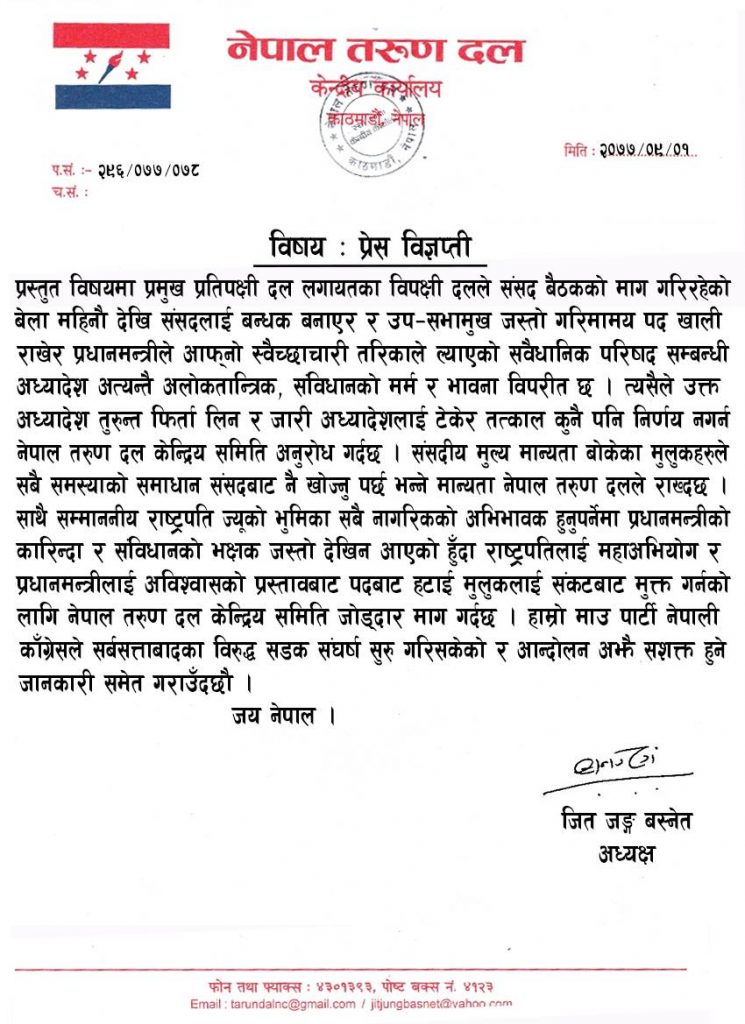 अलोकतान्त्रिक अध्यादेश तुरुन्त फिर्ता गर : तरुण दल | नेपालमाला