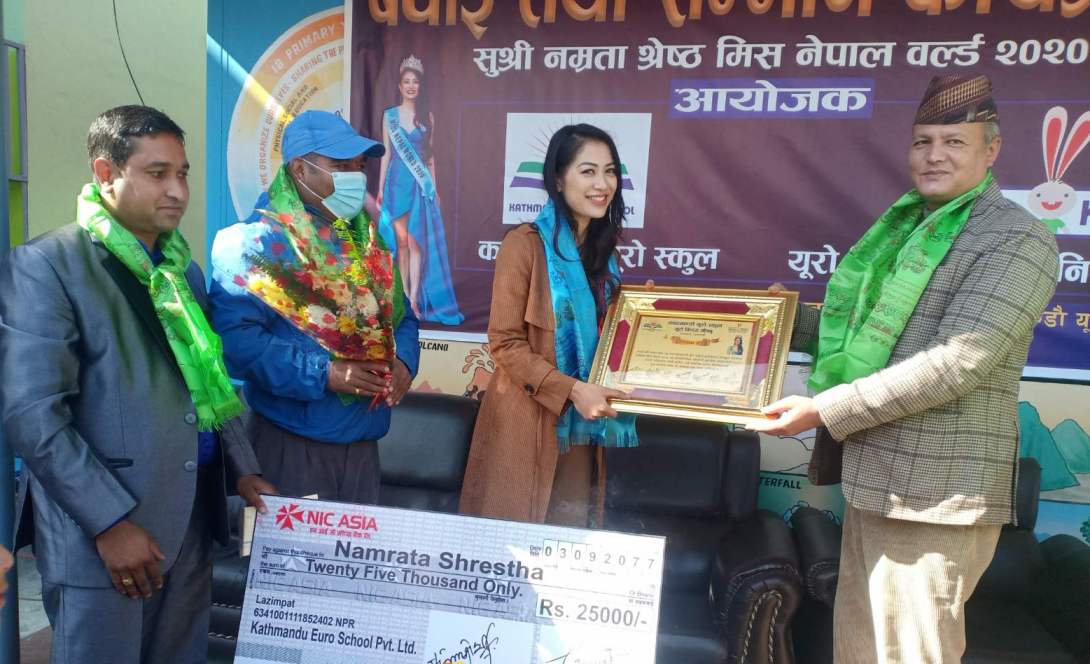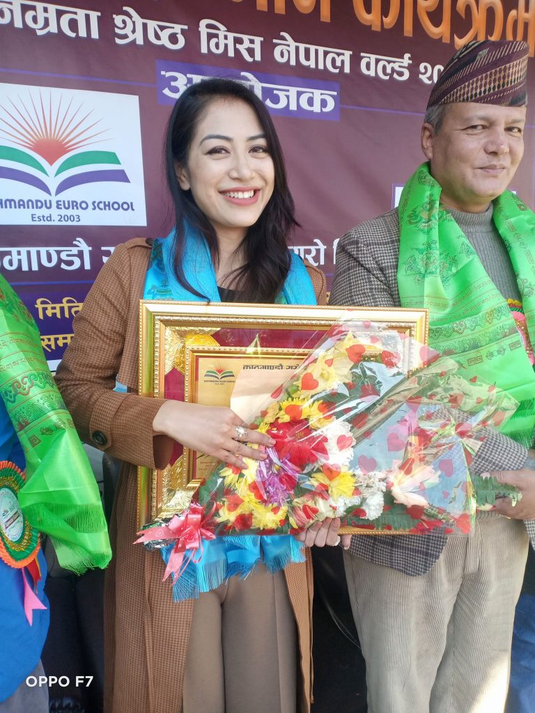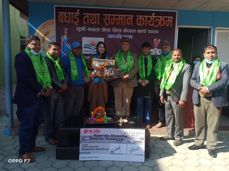 काठमाडौं : काठमाडौं युरो स्कुलको प्रि स्कुल युरो किड्स गोंगबुले मिस नेपाल नम्रता श्रेष्ठलाई शुक्रबार नगदसहित सम्मान गरेको छ । नम्रता युरो किड्सकी शिक्षिका हुन् ।