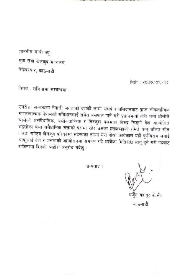 ‘सरकार नपाली जनताको दशकांै लामो संघर्ष र बलिदानबाट प्राप्त नेपालका संविधानलाई असफल बनाउन खलमा लागेको छ’, उनले पत्रमा भनेका छन्, ‘राष्ट्रिय खेलकुद परिषदमा सदसयका रुपमा मेरो दोस्रो कार्यकाल यहीं पूर्णविराम लगाई आपूलाई देश र जनताको आन्दोलनमा समर्पण गर्दै आजैका मितिदेखि लागू हुने गरी पदबाट राजिनामा दिएको व्यहोरा अनुरोध गर्दछु ।’