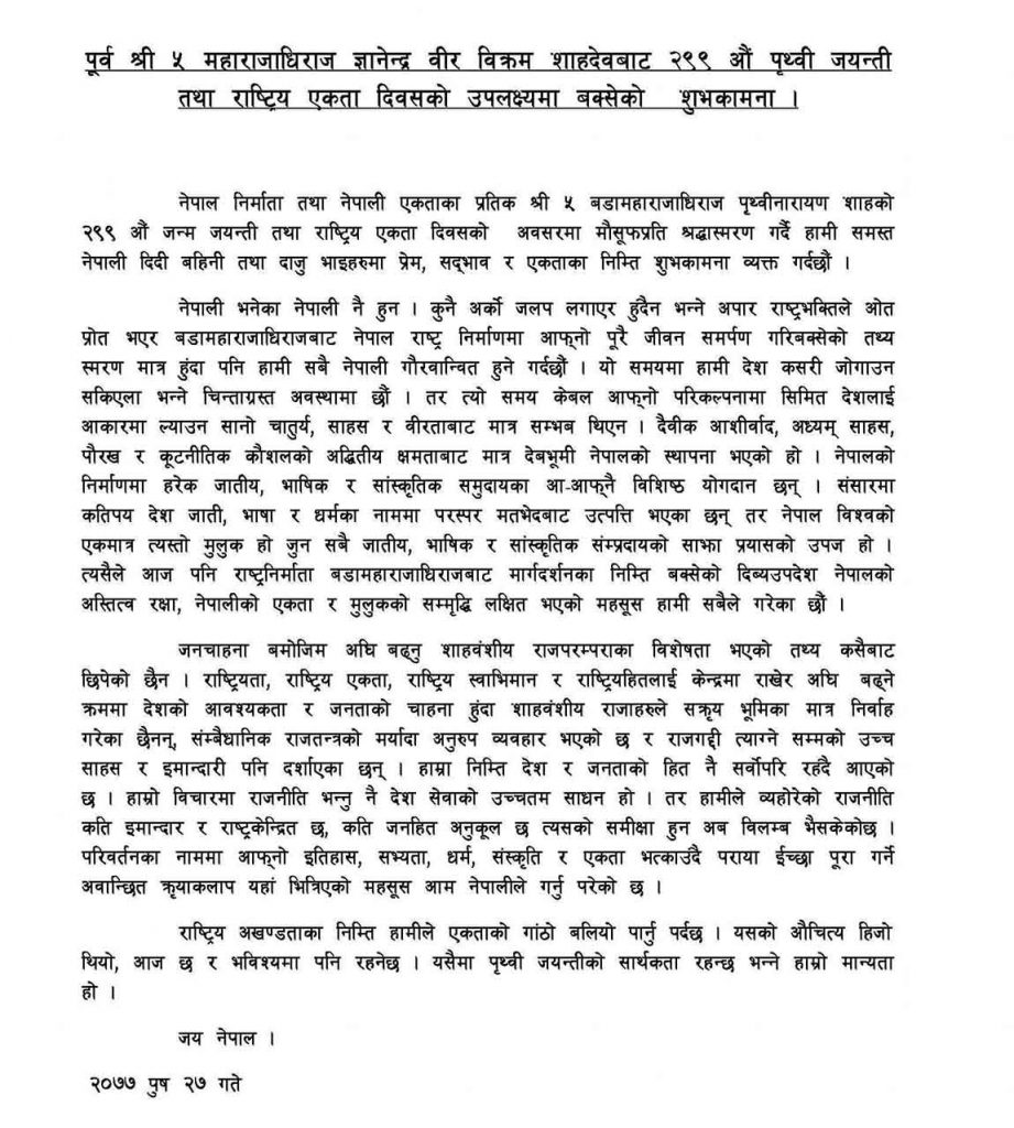 ‘नेपाली भनेका नेपाली नै हुन् । कुनै अर्को जलप लगाएर हुँदैन भन्ने अपार राष्ट्रभक्तिले ओतप्रोत भएर बडामहाराजाधिराजबाट नेपाल राष्ट्र निर्माणमा आफ्नो पूरै जीवन असर्पण गर्नुभएको तथ्य स्मरण मात्र हुँदा पनि हामी सबै नेपाली गौरवान्वित हुने गर्दछौँ’, ज्ञानेन्द्रले भनेका छन्, ‘यो समयमा देश कसरी जोगाउन सकिएला भन्ने चिन्ताग्रस्त अवस्थामा छौँ ।’
