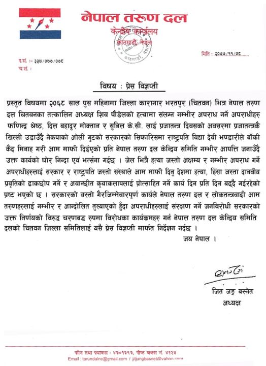 शिव पौडेलका हत्या गर्नेलाई आम माफी दिएकोमा तरुण दलको आपत्ति
