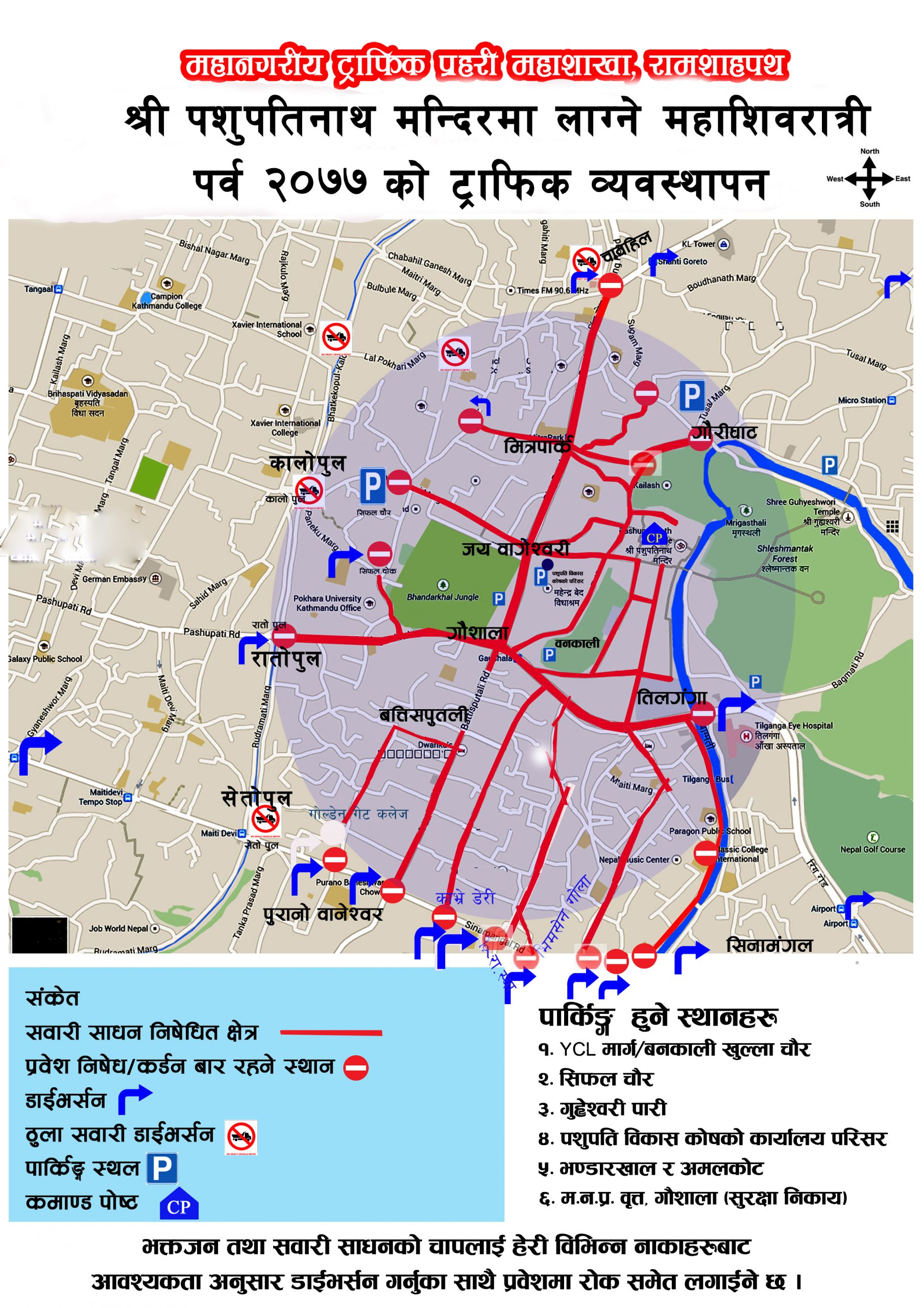 महाशाखाले सूचना निकालेर बिहीबार पशुपतिनाथ मन्दिर वरपरका क्षेत्रमा सवारी निधेष गरेको जनाएको हो । मन्दिर वरपरका क्षेत्र भएर सवारी साधन चलाउनेहरूलाई वैकल्पिक मार्ग प्रयोग गर्न भनिएको छ ।