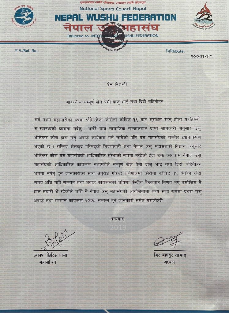 नेपाल उसु महासंघका अध्यक्ष वीरबहादुर तामाङ र महासचिव ल्हाक्पाछिरिङ लामाले बिहीबार एक विज्ञप्ति प्रकाशित गरी उक्त अवार्ड कार्यक्रम राष्ट्रिय खेलकुद परिषद्को नियमावली तथा महासंघको विधान अनुसार स्वयंम्सेवक प्रशिक्षक महासंघको आधिकारिक संस्था नभएको जनाएको छ ।