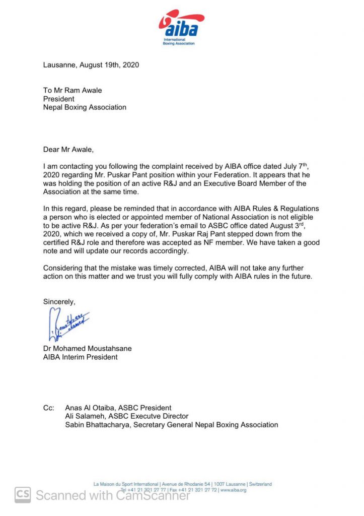 काठमाडौं : नेपाल बक्सिङ संघका केन्द्रीय सदस्य तथा वान स्टार रेफ्री जर्ज (आरजे) पुस्कर पन्तका विषयमा विश्व बक्सिङको सर्वोच्च निकाय आईबा (इन्टरनेसनल बक्सिङ एसोसिएसन) ले गत अगष्ट १९ मा पत्र लेख्दै संघका अध्यक्ष राम अवालेलाई ध्यानाकर्षण गराएको थियो । उक्त पत्रमा संघका पदाधिकारी आरजे हुन नपाउने प्रावधान हुँदाहुँदै पनि पुस्कर पन्तले दोहोरो भूमिका निर्वाह गरेको भन्दै ध्यानाकर्षण गराएको थियो । सोही पत्रमा पन्तले सर्टिफाइड आरजे त्यागेर संघको पदाधिकारी रहने निर्णय गरेकाले उनी आरजे नरहेको जानकारी पनि गराएको थियो ।
