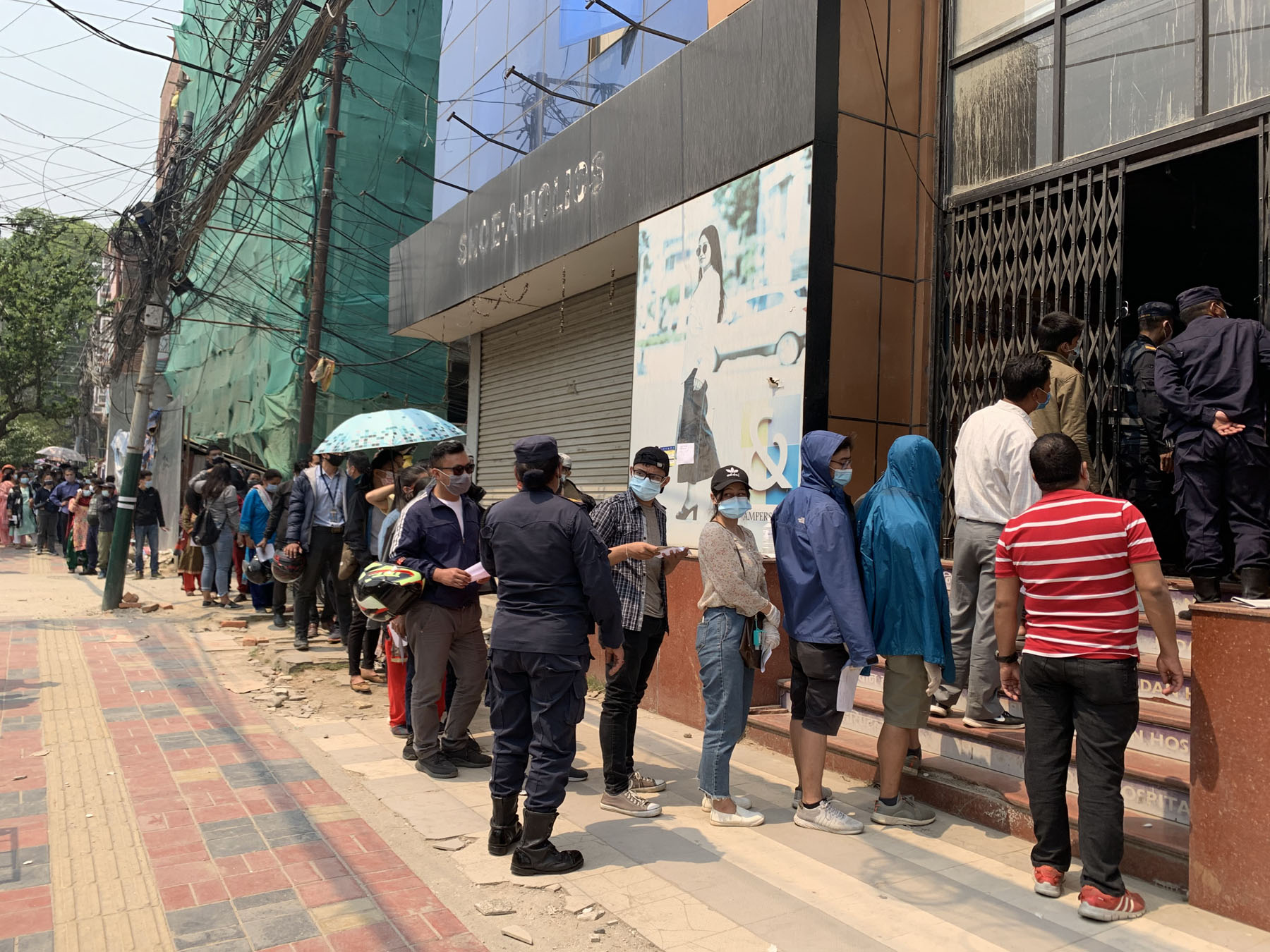काठमाडौँ : थापाथलीस्थित परोपकार प्रसूति तथा स्त्री रोग अस्पतालमा डल्लुका सुरेश बोगटी कोभिड–१९ विरुद्धको खोपको पहिलो मात्रा लगाउनका लागि बिहान ६ बजे पुग्नुभयो । उहाँ पुग्दा टोकन लिनेको भीड थियो । बिहान ७ बजेदेखि बाँडिएको टोकन केहीबेरमा नै सकियो । बिहान साढे ७ बजे कुपन लिनुभएका उहाँको पालो ११ बजे मात्र आएको थियो । “म पुगेको एक घण्टापछि खोपका लागि टोकन बाँड्न शुरु गरिएको थियो,” उहाँले भन्नुभयो, “मैले त्यही लाइनमा बसेर टोकन लिएँ । मेरो टोकन नं ५२१ थियो, बिहान ११ बजेतिर खोप लगाउन पालो आयो ।”