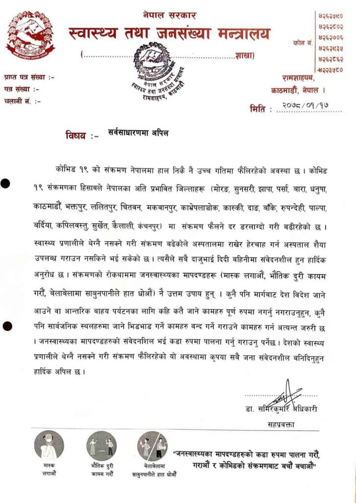 स्वास्थ्य तथा जनसंख्या मन्त्रालयले शुक्रबार अपील जारी गर्दै काठमाडौं उपत्यकासहित २२ जिल्लामा कोरोना संक्रमण डरलाग्दो गरी फैलिरहेको बताएको छ ।