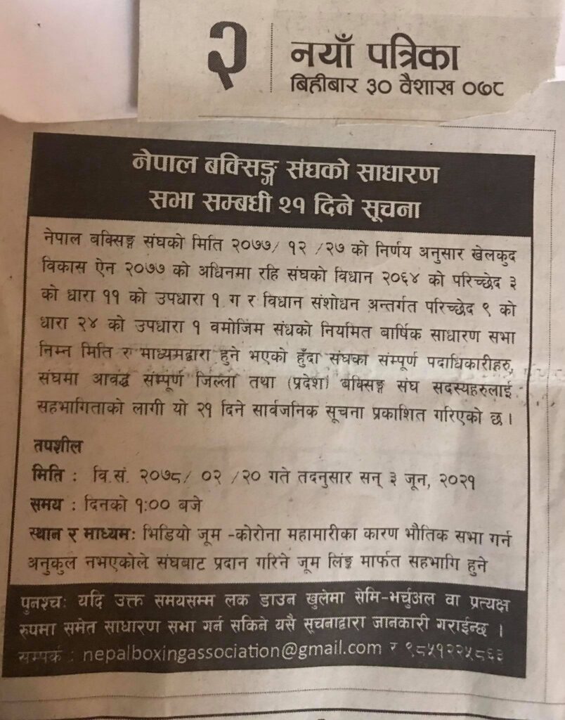 नेपाल बक्सिङ संघले गत वैशाख ३० गते साधारणसभाका लागि सूचना निकालेको थियो । सूचना अनुसार साधारणसभा जेठ २० गते बोलाइएको थियो । संघले कोरोनाको कारण देखाउँदै साधारणसभा भर्चुअल रुपमा गर्ने जनाएको थियो । तर, परिषद्लाई जानकारी नै नदिई एकतर्फी रुपमा साधारणसभा गर्न लागिएको भन्दै परिषद्ले रोक्न निर्देशन दिएको हो । नेपाल बक्सिङ संघका केन्द्रीय सदस्य एवं प्रवक्ता श्याम अवालेले परिषद्को निर्देशन पालना गर्दै साधारणसभा स्थगित गर्ने बताए । ‘परिषद्बाट जस्तो निर्देशन हुन्छ, त्यसको अक्षरसः पालना गछौं’, प्रवक्ता अवालेले भने, ‘नियमित वार्षिक साधारणसभाका लागि स्वीकृति लिनुपर्छ भन्ने थाहा नभएका कारण सूचना आह्वान गरेको हो ।’