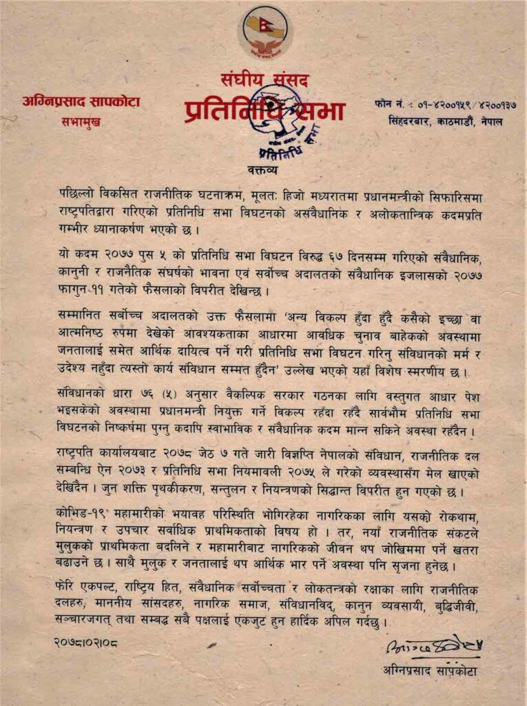 प्रतिनिधिसभा विघटन असंवैधानिक र अलोकतान्त्रिक : सभामुख | नेपालमाला