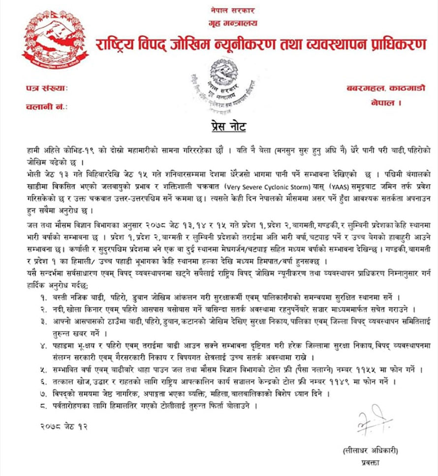 प्राधिकरणले बुधबार प्रेस नोट जारी गर्दै विपद् व्यवस्थापनमा खट्ने सबैले बाढी पहिरोको जोखिम रहेको तटीय क्षेत्र एवं सम्भावित जोखिम क्षेत्रको बस्तीलाई सुरक्षित स्थानमा सार्न आग्रह गरेको हो ।