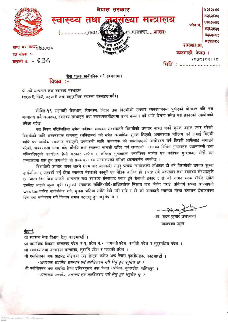 गुणस्तर मापन तथा नियमन महाशाखा प्रमुख डा। मदनकुमार उपाध्यायले जारी गरेको सूचनामा ७ दिनभित्र आफ्नो अस्पताल तथा स्वास्थ्य संस्थाबाट प्रवाह हुने सेवाको प्रकार र त्यसको लागत रकम शीर्षकसमेत उल्लेख भएको मूल्यसूची सञ्चालक समितिबाट निर्णय गराइ वेबसाइट वा सूचना पाटीमा सार्वजनिक गर्न भनिएको छ । त्यस्तै उक्त मूल्यसूचीको विवरण स्वास्थ्य संस्था सञ्चालनको इजाजत दिने निकायमा पनि पठाउन भनिएको छ ।