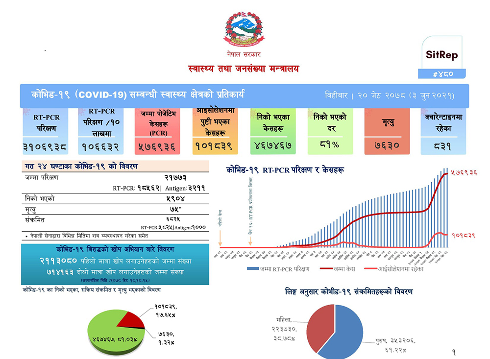 यस्तै पछिल्लो २४ घन्टामा कोरोनाबाट थप ७५ जनाको ज्यान गएको छ। यो सहित नेपालमा कोरोनाबाट ज्यान गुमाउनेको संख्या ७ हजार ६३० पुगेको छ। मन्त्रालयका अनुसार बिहीबार ५ हजार ९०४ जना कोरोनामुक्त भएका छन्। हाल १ लाख १८ हजार ३९ जना कोरोनाका सक्रिय संक्रमित छन्।