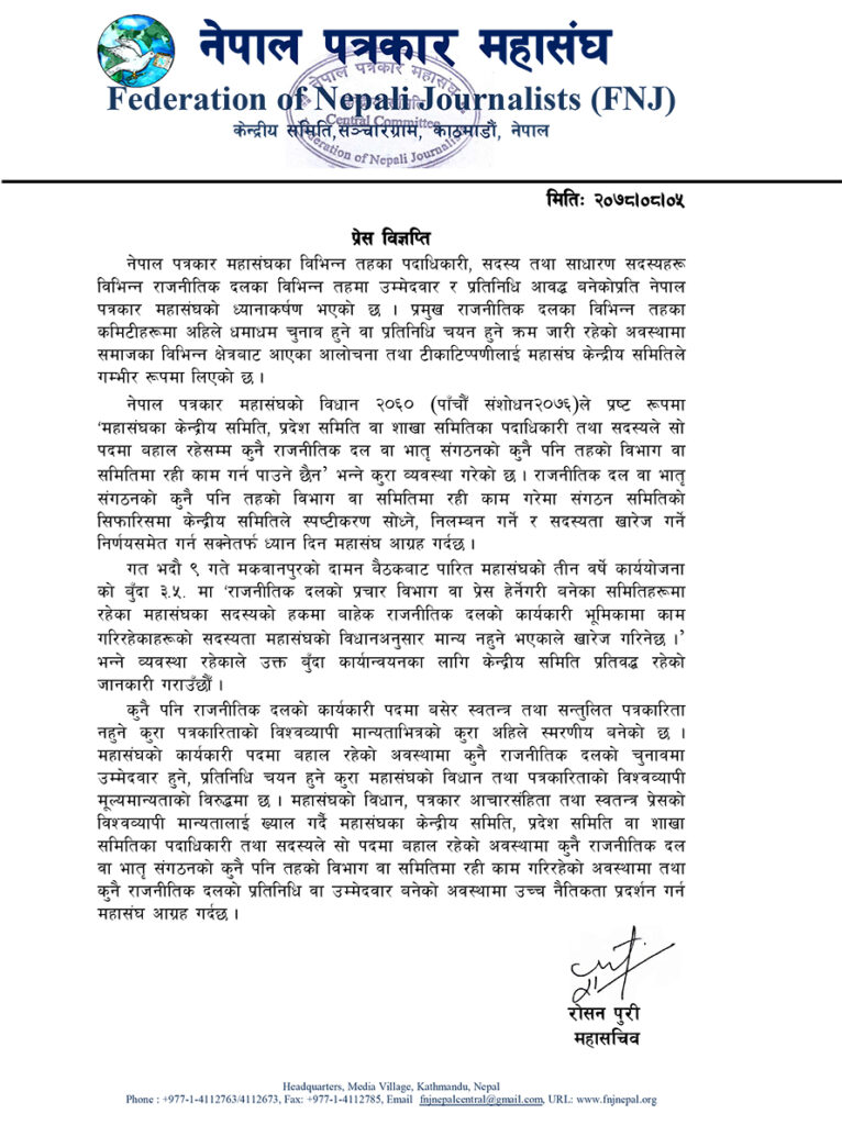 कुनै पनि राजनीतिक दलको कार्यकारी पदमा बसेर स्वतन्त्र तथा सन्तुलित पत्रकारिता नहुने भन्दै महासंघले महासंघको कार्यकारी पदमा बहाल रहेको अवस्थामा पनि कुनै दलको चुनावमा उम्मेदवार हुने, प्रतिनिधि चयन हुने कुरा महासंघको विधान तथा पत्रकारिताको विश्वव्यापी मूल्यमान्यताको विरुद्ध रहेको बताएको छ ।