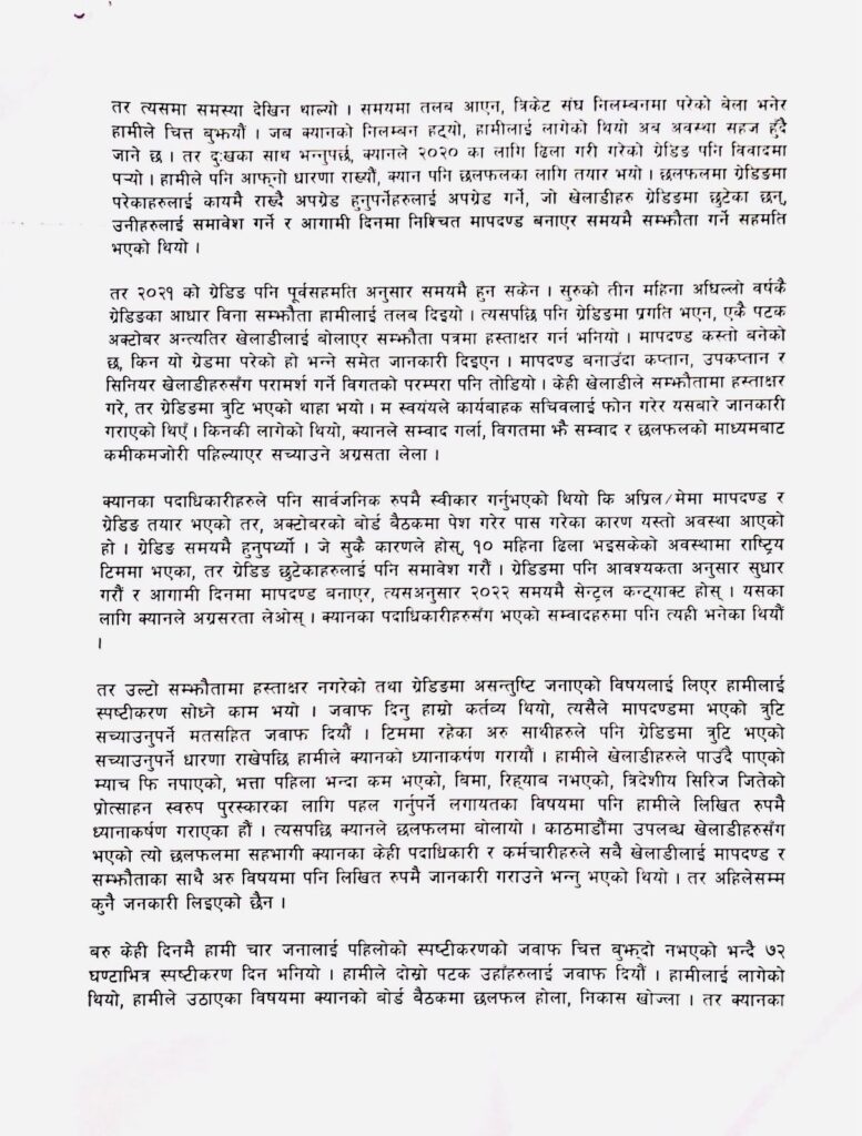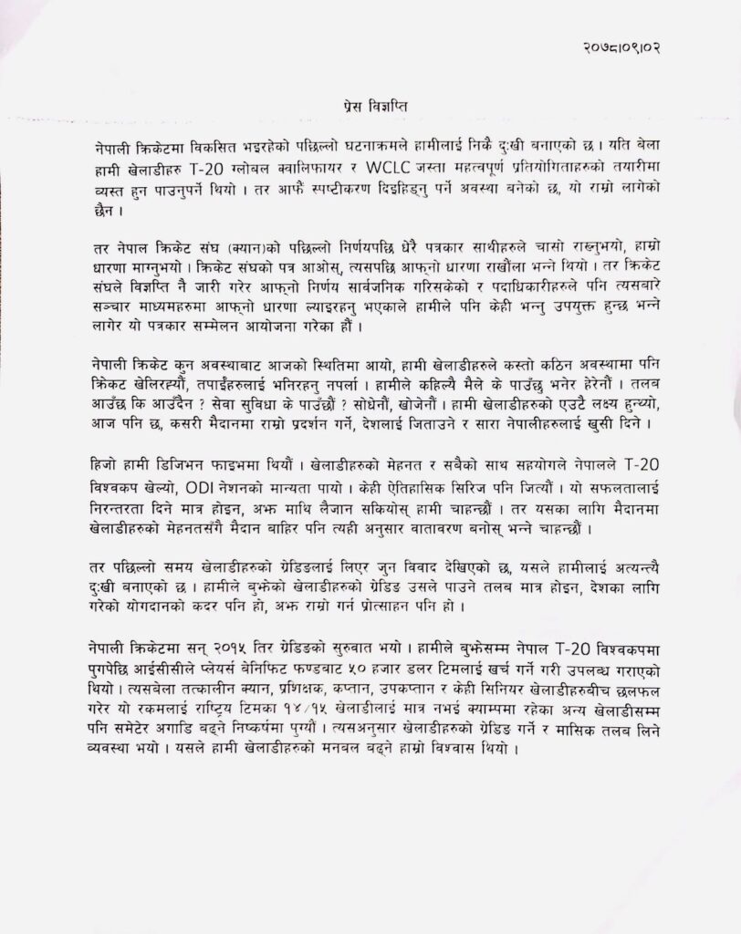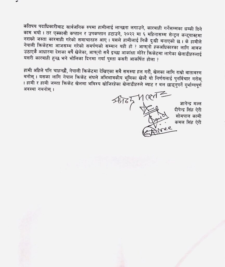 क्यानको निर्णयले क्रिकेटमा भविष्य खोजिरहेका खेलाडीले ब्याट र बल छाड्नुपर्ने दुर्भाग्यपूर्ण अवस्था आउन नदिन समेत खेलाडीहरुले अपिल गरेका छन् । ‘क्यानले यस निर्णयमा पुनर्विचार गरोस् भन्ने चाहन्छौं । हामी सबै एउटै परिवार हौं । एकै ठाउँमा बसेर संवादबाट निकास निकालौ भन्ने चाहेका छौं’ मल्लले पत्रकारसँग भने ।