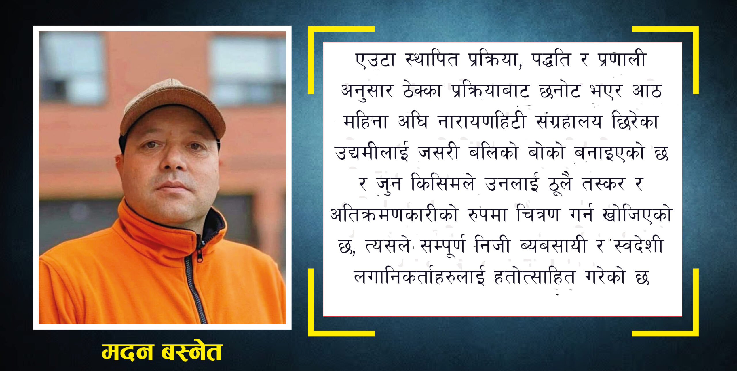 सम्पूर्ण ठेक्का प्रक्रिया, ठिक बेठीक वा सहि गलत त्यसको सुक्ष्म अध्यन नै नगरी सिनेमाको हिरोले जस्तो स्टन्ट देखाउने उनको हत्तारोले एउटा स्वदेशी उद्यमीले अनाहकमा ठूलो बद्नामी पनि भोग्नु परेको छ। एउटा स्थापित प्रक्रिया, पद्धति र प्रणाली अनुसार ठेक्का प्रक्रियाबाट छ्नोट भएर आठ महिना अघि नारायणहिटी संग्रहालय छिरेका उद्यमीलाई जसरी बलिको बोको बनाइएको छ र जुन किसिमले उनलाई ठूलै तस्कर र अतिक्रमणकारीको रुपमा चित्रण गर्न खोजिएको छ, त्यसले सम्पूर्ण निजी ब्यबसायी र स्वदेशी लगानिकर्ताहरुलाई हतोत्साहित गरेको छ।