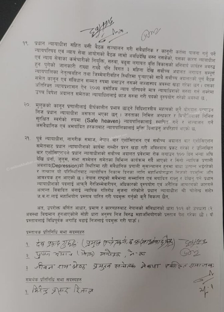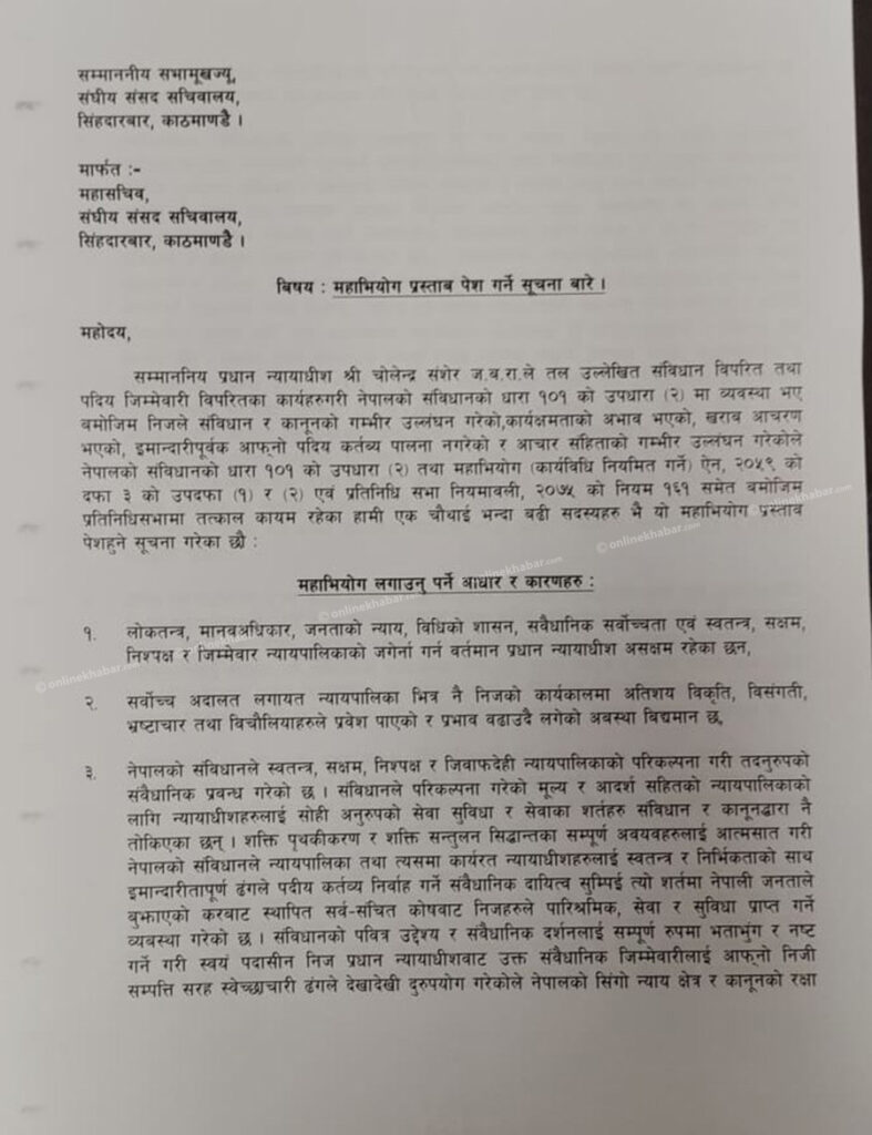 काठमाडौँ : सत्ता गठबन्धनका सांसदहरूले प्रधानन्यायाधीश चोलेन्द्रशमशेर जबराविरुद्ध आइतबार २१ बुँदे अभियोग प्रस्ताव दर्ता गराएका छन् । अभियोगपत्रमा कांग्रेस सचेतक पुष्पा भुसाल, नेकपा माओवादी केन्द्रका सचेतक देव गुरुङ र नेकपा एकीकृत समाजवादीका सांसद जीवनराम श्रेष्ठले प्रस्ताव गरेका छन् भने उक्त प्रस्तावमा ९८ सांसदको हस्ताक्षर छ ।