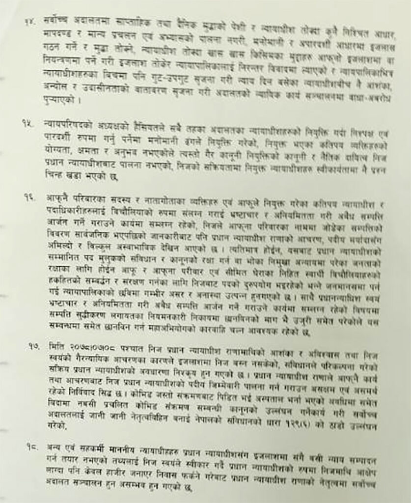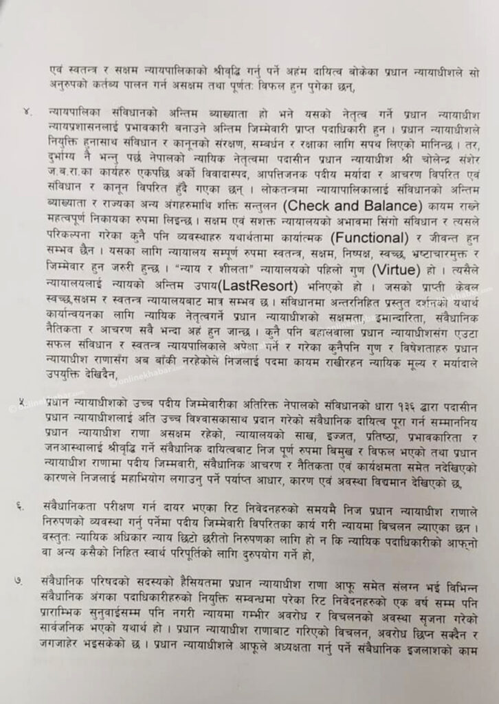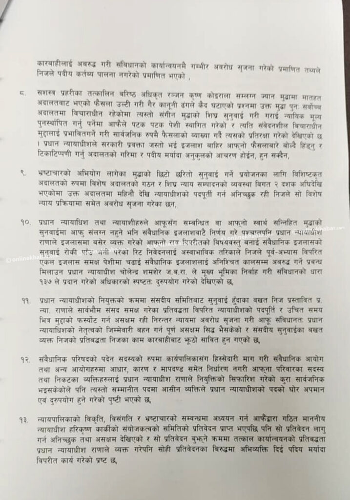 उनीहरूले प्रधानन्यायाधीशविरुद्ध लोकतन्त्र, मानवअधिकार, जनताको न्याय‚ विधिको शासन, संवैधानिक सर्वोच्चता एवम् स्वतन्त्र निष्पक्ष र जिम्मेवार न्यायलयको जगेर्ना गर्न वर्तमान प्रधानन्यायाधीश अक्षम रहेको आरोप लगाएका छन् ।