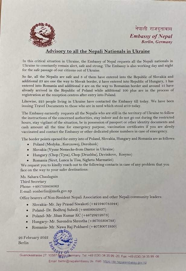 रुसले आक्रमण थालेपछि युक्रेनमा फसेका विदेशी नागरिकहरुका लागि मानवीय सहायताको आधारमा पोल्यान्ड, स्लोभाकिया, हंगेरी र रोमानियाले आ-आफ्ना देशका सिमाना खुल्ला गरिदिएका छन् । नेपालीहरुलाई पनि आवश्यक कागजपत्र बोकेरै तिनै देशतर्फ जान वर्लिनस्थित दूतावासले आग्रह गरेको छ । पासपोर्ट, नगद, कोरोनाविरुद्धको खोप लगाएको भए सो खोपकार्डसमेत आफूसँग राखिराख्न दूतावासले सुझाव दिएको छ ।