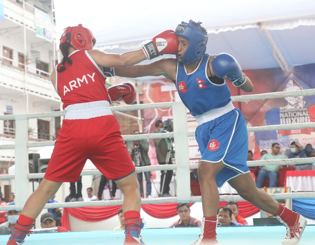 काठमाडौं : त्रिभुवन आर्मी क्लबकी चन्द्रकला थापा र एपीएफकी नाङ्जा बुढामगर ‘गणेशमान सिंह स्मृति राष्ट्रिय बक्सिङ’ प्रतियोगिताको सेमिफाइनलमा प्रवेश गरेका छन् । बुधबार बसन्तपुर डबलीमा भएको महिला ५७ केजी तौल समूहमा चन्द्रकलाले बागमती प्रदेशकी स्वस्तिका तिरुवा र नाङ्जाले लुम्बिनी प्रदेशकी जानकी थापामगरलाई हराउँदै अन्तिम चारमा स्थान बनाउका हुन् ।
