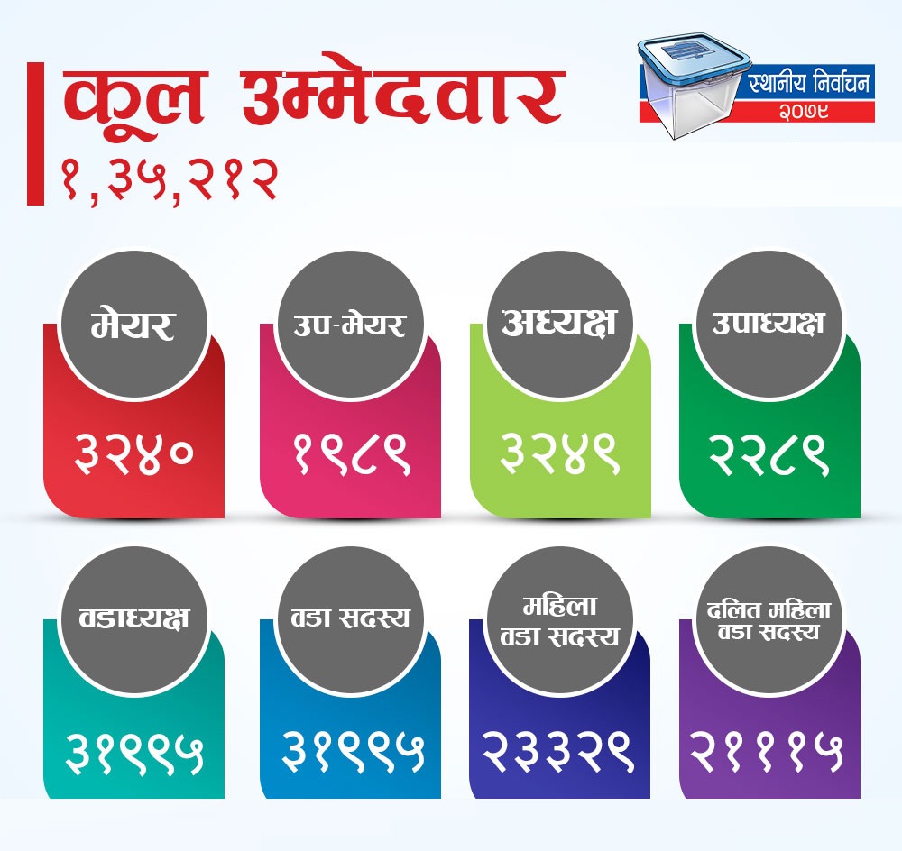 स्थानीय तहका ३५ हजार २२१ पदमा यही वैशाख ३० गते हुने चुनावका लागि वैशाख ११ र १२ गते देशभर मनोनयन दर्ता गरिएको थियो ।