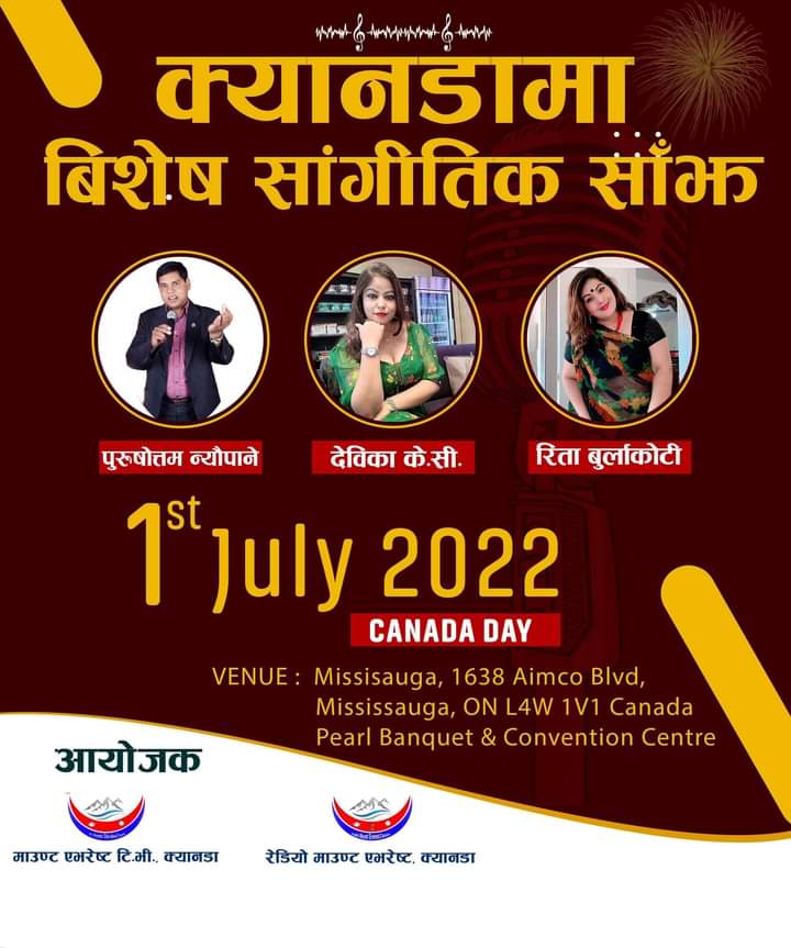 क्यानडामा नेपालीहरुको बाक्लो बसोबास रहेको शहर मिसिसागा स्थित पर्ल बैंकेट एण्ड कन्भेन्सन सेन्टरमा आयोजना हुन गइरहेको उक्त सांगीतिक साँझमा नेपालका बरिष्ठ लोक गायक पुरुषोत्तम न्यौपानेको बिशेष प्रस्तुति रहने छ भने क्यानाडाबाट गायिकाद्धय देबिका केसी र रिता बुर्लाकोटीले पनि सांगीतिक कोसेली प्रस्तुत गर्नेछन्। साथसाथै क्यानाडामा बसोबास गरिरहेका अन्य स्थानीय नेपाली कलाकारहरुले पनि नृत्य लगायतका सांस्कृतिक कोसेलीहरु प्रस्तुत गर्नेछ्न्।