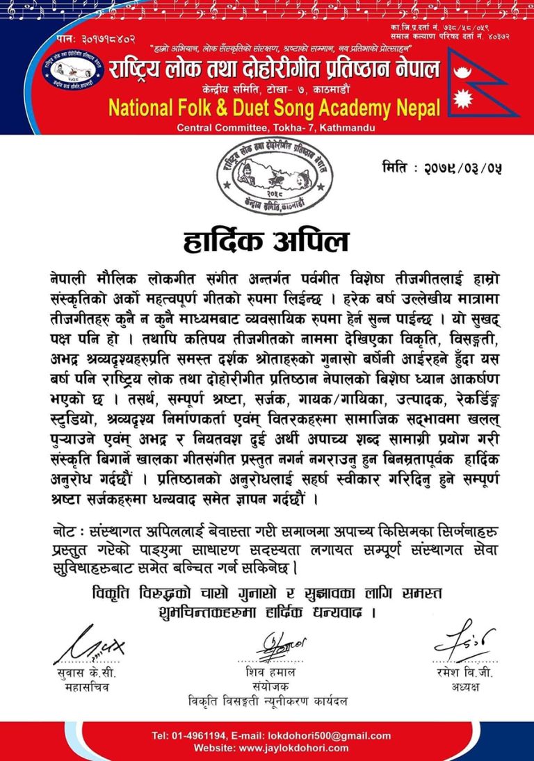 काठमाडौं : राष्ट्रिय लोक तथा दोहोरी गीत प्रतिष्ठानले सामाजिक सदभावमा खलल पुर्याउने, अभद्र, द्विअर्थी र अपाच्य किसिमका तीज गीत सार्वजनिक नगर्न आग्रह गरेको छ । अध्यक्ष रमेश बीजीले विज्ञप्ति जारी गर्दै संस्थागत आग्रहलाई बेवास्ता गरिए साधारण सदस्यता लगायत संस्थागत सेवाबाट समेत बञ्चित गर्ने चेतावनी दिएका छन् ।