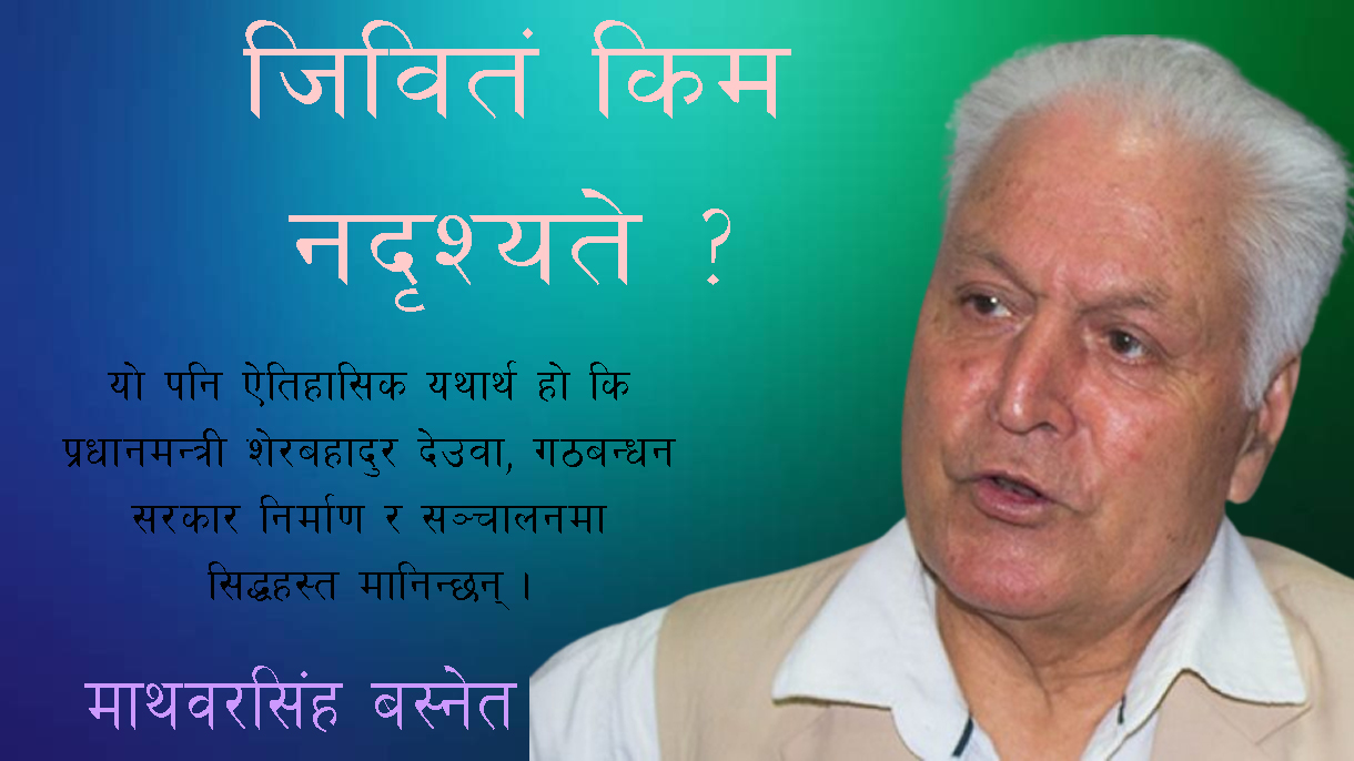 यो शास्त्रोक्त कथनलाई, नेपालको वर्तमान गठबन्धन सरकारले शब्द र भावना दुवैले उदाहरणीय रूपमा पालना गरेको छ । जीवित भए मात्र सबैथोक देख्न पाइने हो । मरेपछि त सिद्धिहाल्यो नि ! हुन पनि सबैथोक बाँचुञ्जेल मात्र चाहिने हो । मरेपछि डुमै राजा ! हाम्रो परम्परागत मान्यता यही हो । प्रधानमन्त्री तथा नेपाली कांग्रेसका सभापति शेरबहादुर देउवा, त्यस्ता भौतिकवादी नेता हुन्, जो मरेर स्वर्ग देख्ने कुरामा विश्वास गर्दैनन् । जिउँदाले मात्र सबैथोक देख्न सक्छ भन्ने व्यवहारवादी विज्ञानमा उनको पूर्ण विश्वास रहेको छ ।
