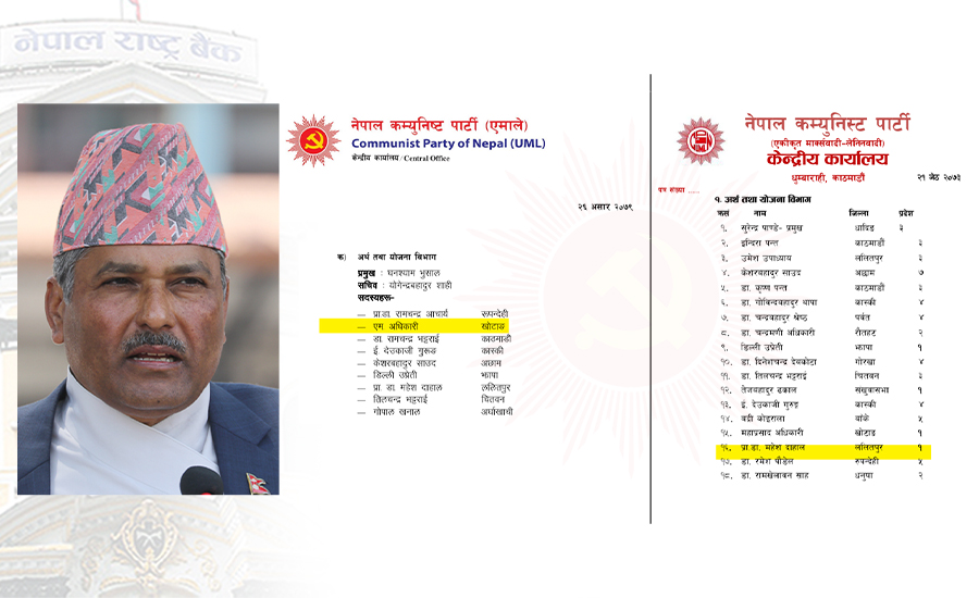 काठमाडौं : नेकपा एमालेको अर्थ तथा योजना विभागको सदस्यका रुपमा नाम आएपछि गभर्नर महाप्रसाद अधिकारीमाथि गम्भीर कानुनी तथा नैतिक प्रश्न खडा भएको छ । खोटाङको ठेगानासहित ‘एम. अधिकारी’ उल्लेख गरेर गभर्नरलाई विभागमा राखिएपछि नेकपा एमालेतर्फ पनि प्रश्न सोझिएको छ ।