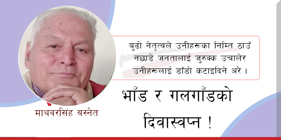 हामी बाँचेको वर्तमान युग, साइबर युग हो, त्यसमा कसलाई शंका छ र ? त्यो पनि नयाँ पुस्ताको पेवा हो अरे । त्यसैले यो युगलाई हाँक्न पुराना पुस्ताका नेता काम लाग्दैनन् अरे । नयाँ पुस्तालाई समसामयिक विश्वमा चलेका हावा र ट्रेन अनुसारका फेसन तथा त्यही फेसनमा नाच्ने नटुवा तथा भँडुवा चाहिन्छ रे । त्यही कारण फेसबुकवाजहरूको पुस्तालाई शेरबहादुर देउवा र केपी शर्मा ओली चाहिँदैन अरे । उनीहरू आउटडेटेड भइसके रे । त्यत्तिमात्र होइन– कांग्रेस र कम्युनिस्ट पार्टी र तिनका हाँगाबिँगा पनि काम नलाग्ने भइसके अरे । त्यसैले उनीहरूलाई नयाँ पुस्ताको मागअनुसार गाइने र भाँडहरूलाई देशको नेतृत्व सुम्पनुप¥यो अरे । बुढो नेतृत्वले उनीहरूका निम्ति ठाउँ नछाडे जनतालाई जुरुक्क उचालेर उनीहरूलाई डाँडो कटाइदिने अरे ।