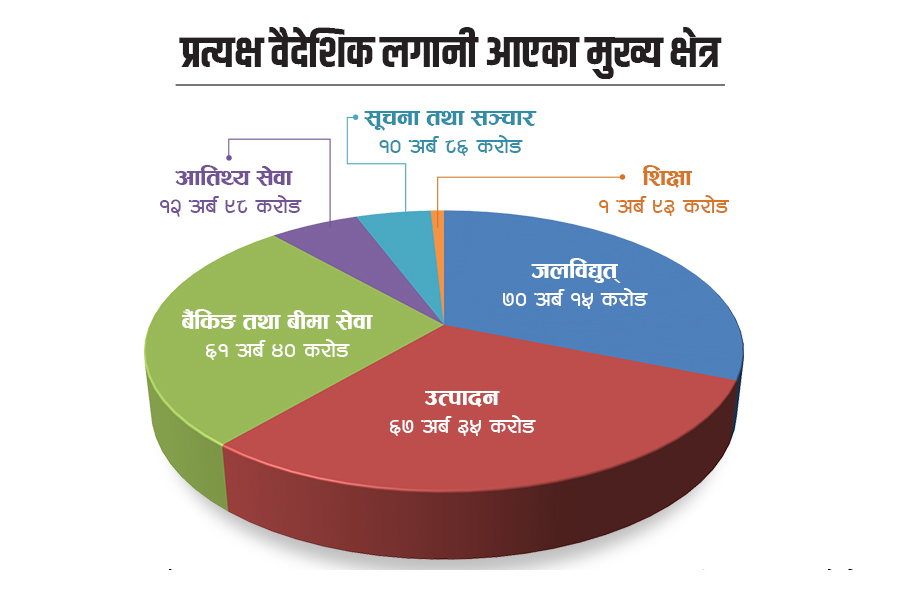 नेपालमा रहेको प्रत्यक्ष वैदेशिक लगानीमध्ये ६०.५ प्रतिशत औद्योगिक क्षेत्रमा र ३९.४ प्रतिशत सेवा क्षेत्रमा रहेको देखिन्छ । औद्योगिक क्षेत्रअन्तर्गत जलविद्युत् क्षेत्रमा ३०.८ प्रतिशत र उत्पादन क्षेत्रमा २९.५ प्रतिशत वैदेशिक लगानी रहेको देखिन्छ । यसै गरी, कुल प्रत्यक्ष वैदेशिक लगानीमध्ये २६.९ प्रतिशत सेवा क्षेत्र अन्तर्गत बैंक तथा वित्तीय संस्था र बीमा कम्पनीहरूमा रहेको छ।