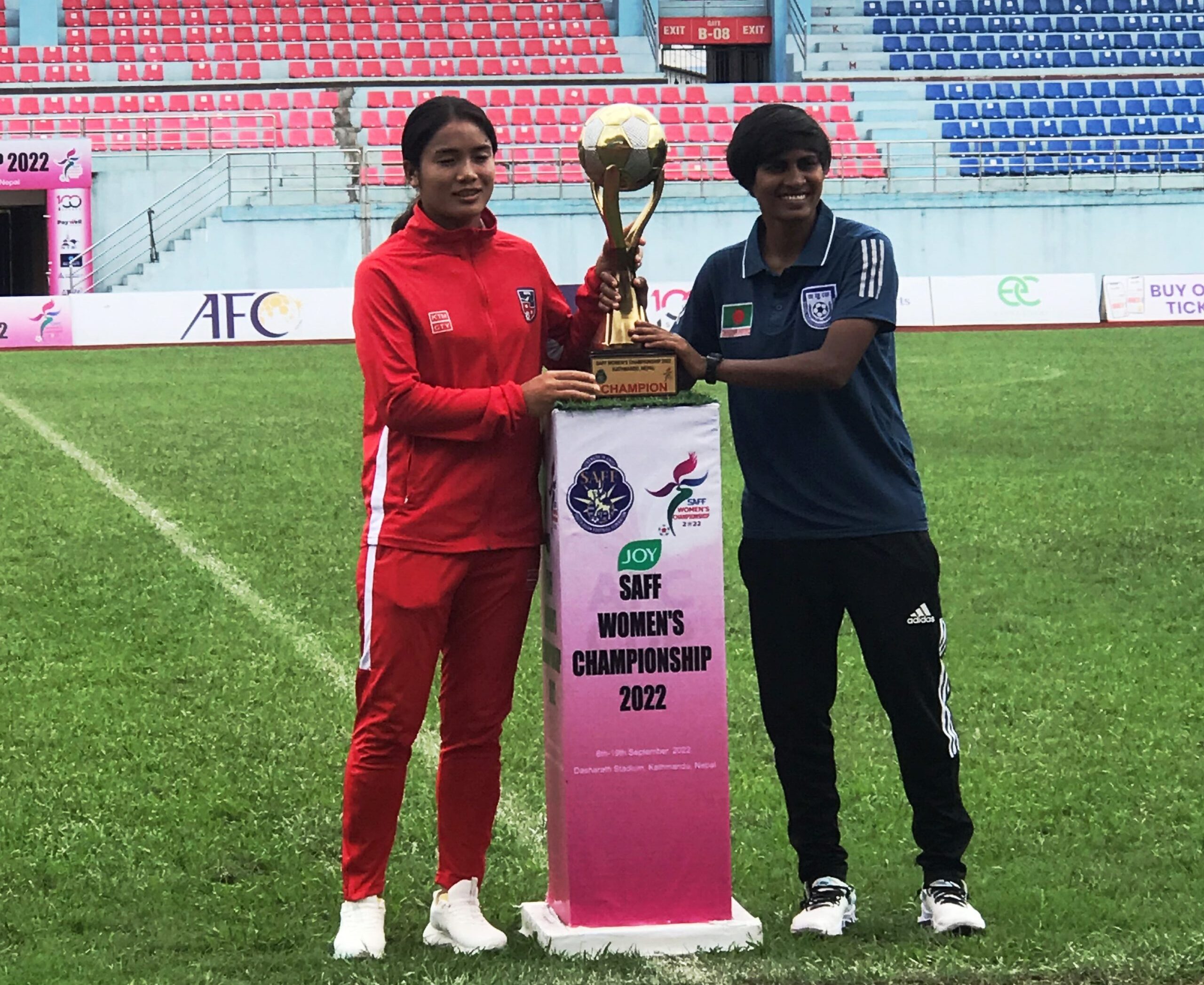 काठमाडौं : छैटौं संस्करणको साफ महिला च्याम्पियनसिप फुटबलको उपाधिका लागि घरेलु टोली नेपाल र बंगलादेश आज फाइनल खेल्दैछन् । खेल त्रिपुरेश्वरस्थित दशरथ रंगशालमा साँझ ५ बजे सुरु हुनेछ । नेपाल र बंगलादेशको फाइनल खेल हेर्न १० हजार भन्दा बढी दर्शकले टिकट लिइसकेका छन् । नेपाल र बंगलादेश जसले जितेपछि साफको नयाँ च्याम्पियन बन्दै इतिहास रच्नेछन् ।