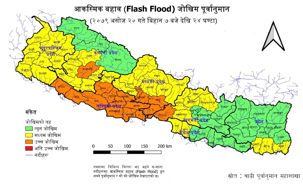 आज बागमती प्रदेशको चितवन, रुकुम पूर्वबाहेक लुम्बिनी प्रदेशका सबै जिल्ला, गण्डकी प्रदेशका नवलपरासी पूर्व, तनहुँ र स्याङ्जा तथा कर्णाली प्रदेशको जाजरकोटका नदीहरुमा बहाव उल्लेख्य बढ्ने पूर्वानुमान छ ।