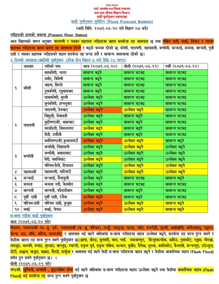 यसैगरी झापा, मोरङ, सुनसरी, बारा, पर्सा, मकवानपुर, सिन्धुपाल्चोक, धादिङ, नुवाकोट, रसुवा गोरखा, लम्जुङ, कास्की, मनाङ, मुस्ताङका नदीहरुमा बहाव बढ्ने र केहीमा आकस्मिक बाढी आउने पूर्वानुमान छ । यसैगरी बागलुङ, म्याग्दी, रुकुम पूर्व, रुकुम पश्चिम, सल्यान, सुर्खेत, दैलेख, जुम्ला, कालिकोट, कैलाली, कन्चनपुर, डडेलधुरा, डोटी, अछाम, बाजुरा, बझाङ, बैतडी र दार्चुलाका नदीहरुमा पनि बहाव बढ्ने र केहीमा आकस्मिक बाढी आउने पूर्वानुमान रहेको बाढी सूचना केन्द्रले जनाएको छ । असोज २१ गते भने लुम्बिनी, कर्णाली र सुदूरपश्चिम प्रदेश भई बग्ने अधिकांश नदीहरुमा बहाव उल्लेख्य बढ्ने छ ।