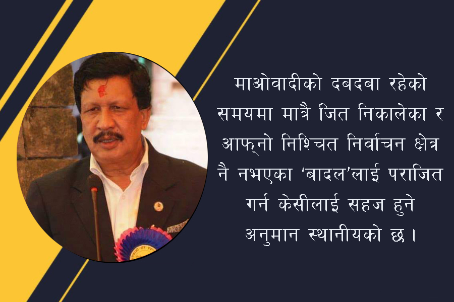 गुल्मीमा जन्मिएका एमाले नेता रामबहादुर थापा ‘बादल’ २०६४ को पहिलो संविधानसभा निर्वाचनमा चितवन क्षेत्र नम्बर ३ बाट निर्वाचित भएका थिए । २०७४ मा राष्ट्रियसभा सदस्य हुँदै उनी गृहमन्त्री बनेका थिए । त्यसैले माओवादीको दबदबा रहेको समयमा मात्रै जित निकालेका र आफ्नो निश्चित निर्वाचन क्षेत्र नै नभएका ‘बादल’लाई पराजित गर्न पूर्व युवा तथा खेलकुद मन्त्रीसमेत रहेका केसीलाई सहज हुने अनुमान स्थानीयको छ ।
