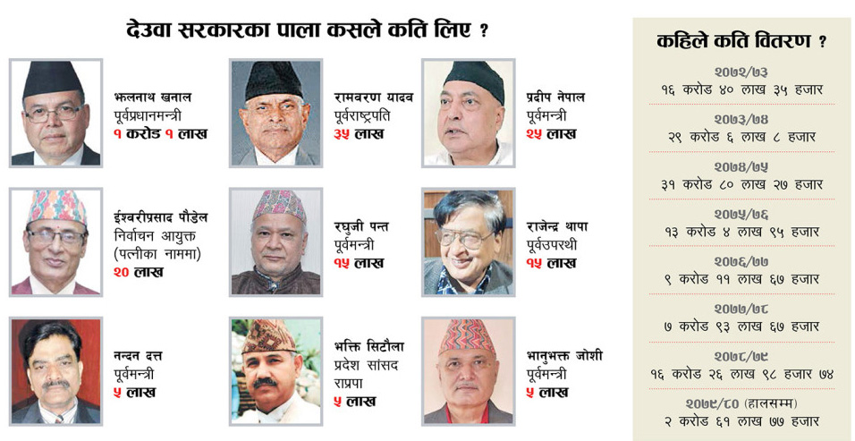 विगतमा राज्यको ढुकुटीबाट मोटो रकम लिनेमा माओवादी नेता एवं उपप्रधान तथा भौतिक पूर्वाधारमन्त्री नारायणकाजी श्रेष्ठ, माओवादीकै पूर्णकुमारी सुवेदी, कांग्रेसका नरहरि आचार्य र देवेन्द्रराज कँडेल, कांग्रेसकै तत्कालीन नेता गोविन्दराज जोशी, नेपाल समाजवादी पार्टीका अध्यक्ष तथा पूर्वमन्त्री महिन्द्र राय यादवलगायत छन् । उनीहरू पटक–पटक मन्त्री बनेर लाभको पदमा बसिसकेका छन् । कांग्रेस नेतृ सुजाता कोइरालालाई सरकारले २०७३ कात्तिकमा ५० लाख रुपैयाँ दिएको थियो । कांग्रेसकै भीमसेनदास प्रधानले पनि २५ लाख बुझेका थिए ।