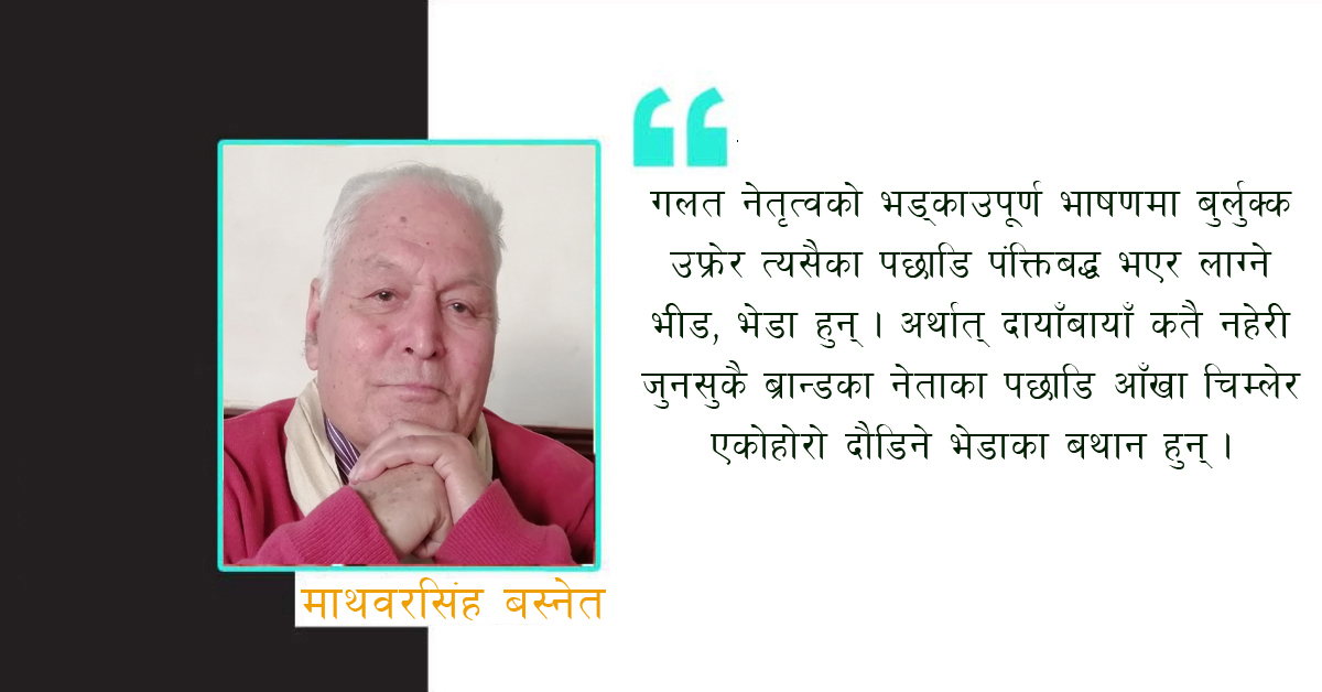 त्यसको सरल र सोझो अर्थ थियो– गलत नेतृत्वको भड्काउपूर्ण भाषणमा बुर्लुक्क उफ्रेर त्यसैका पछाडि पंक्तिबद्ध भएर लाग्ने भीड, भेडा हुन् । अर्थात् दायाँबायाँ कतै नहेरी जुनसुकै ब्रान्डका नेताका पछाडि आँखा चिम्लेर एकोहोरो दौडिने भेडाका बथान हुन् ।