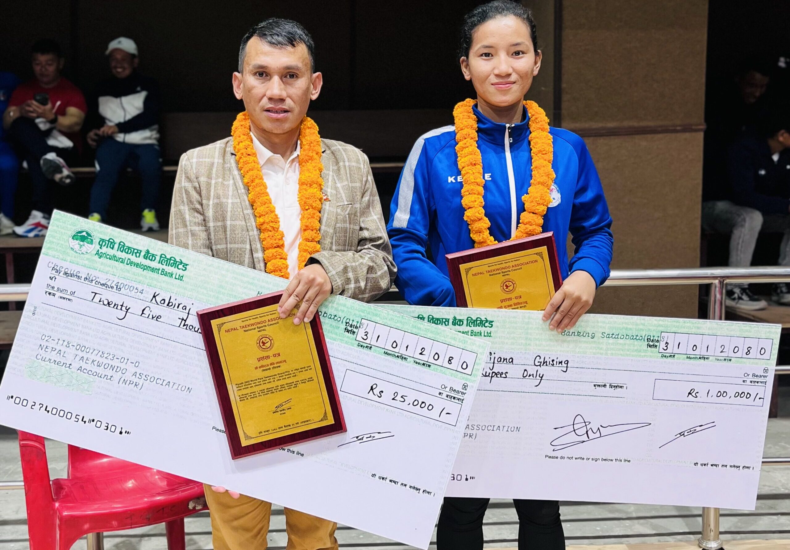 काठमाडौं : नेपाल तेक्वान्दो संघले पारा तेक्वान्दो खेलाडी सिर्जना घिसिङ र प्रशिक्षक कविराज नेगी लामालाई नगदसहित सम्मान गरेको छ । युवा तथा खेलकुदमन्त्रीले डिगबहादुर लिम्बूले सिर्जनालाई एक लाख र प्रशिक्षक लामालाई २५ हजार रुपैयाँ नगदसहित सम्मान गरेका हुन् ।