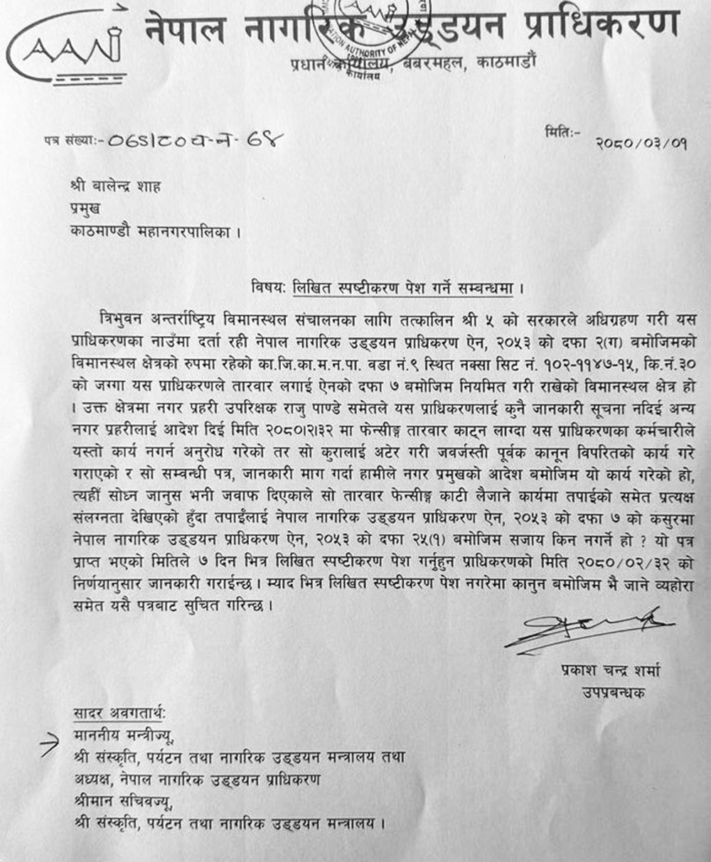 काठमाडौँ : सिनामंगलस्थित त्रिभुवन अन्तर्राष्ट्रिय विमानस्थल क्षेत्रमा पूर्वजानकारी र सूचना नदिई फेन्सिङ तार काटेको विषयमा नेपाल नागरिक उड्डयन प्राधिकरणले काठमाडौं महानगर प्रमुख बालेन्द्र शाह (बालेन) सहित तीन जनालाई स्पष्टीकरण सोधेको छ ।